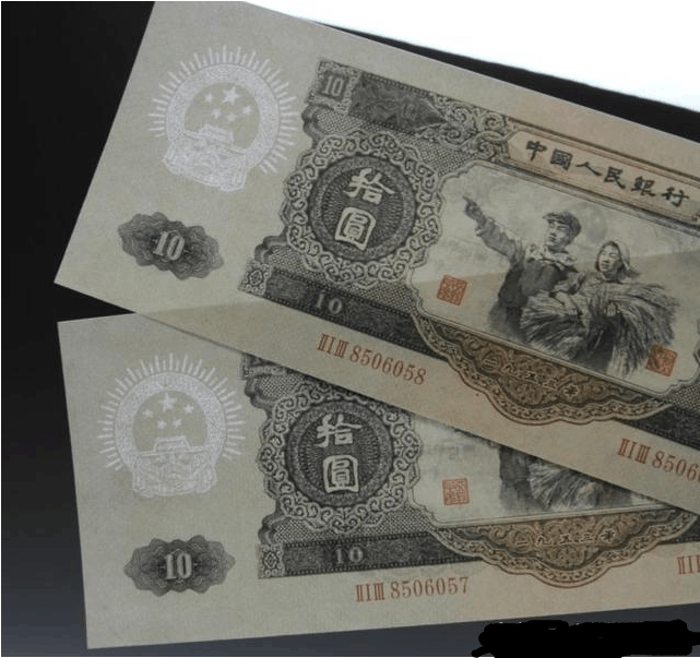 1953年10元纸币的正面图案是劳作的工人和手捧稻谷农妇,两人一起看向前方,寓意朝着新生活和新希望,整体体现了我国劳动人民的整体风采。
