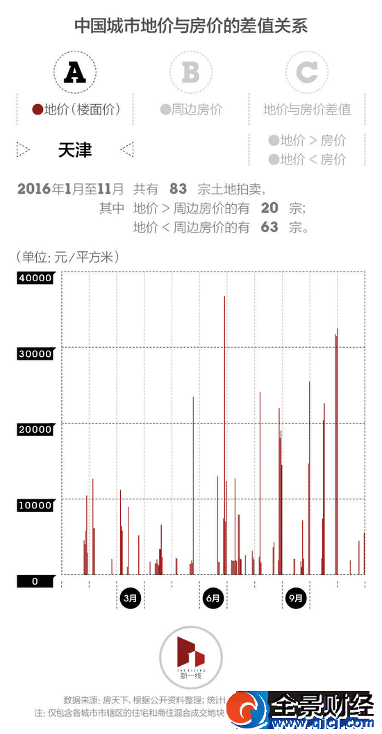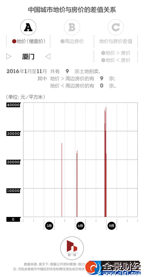 典型的例子是2016年8月融信以10万元/平方米的楼面价格拿下上海内环线中兴路地块,而这块地附近的次新房房价仅是每平方米7万至8万元左右。更夸张的,在厦门、东莞、合肥、天津和郑州,去年还出现了楼面价超过周边房价两倍以上的土地。