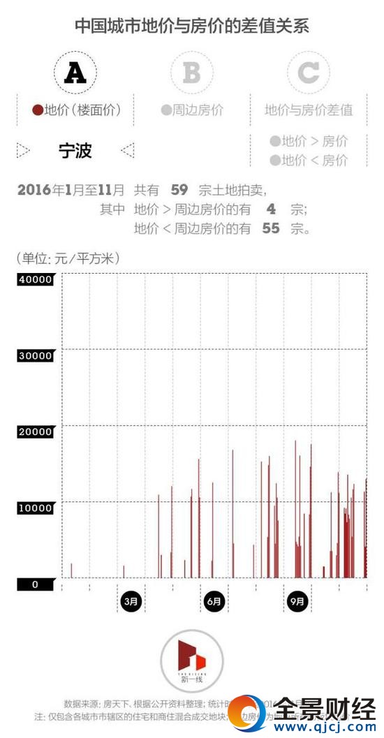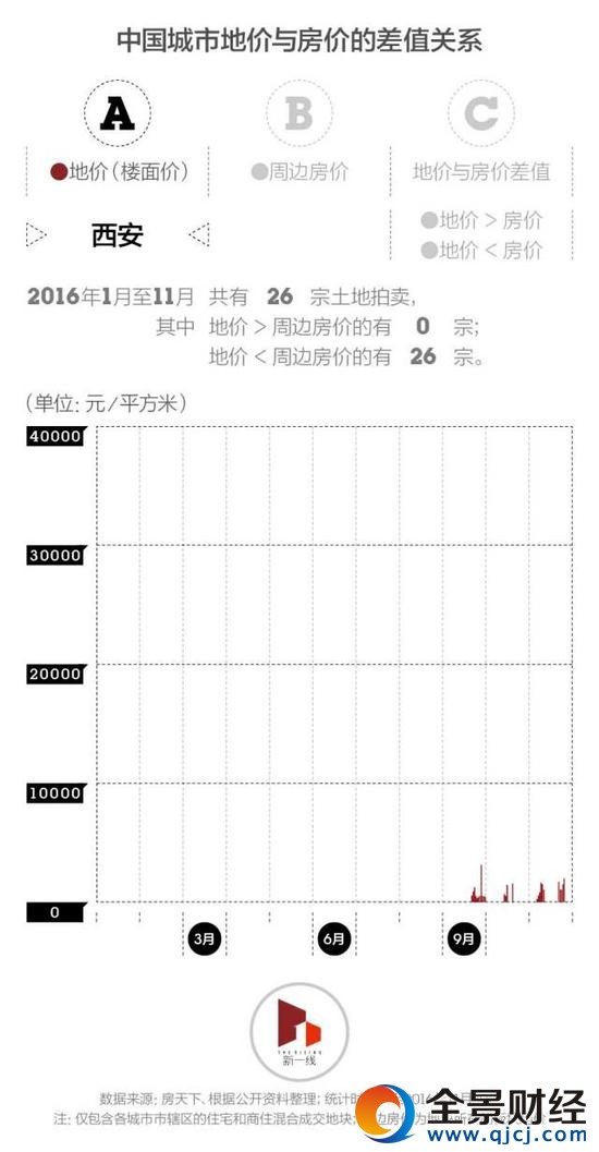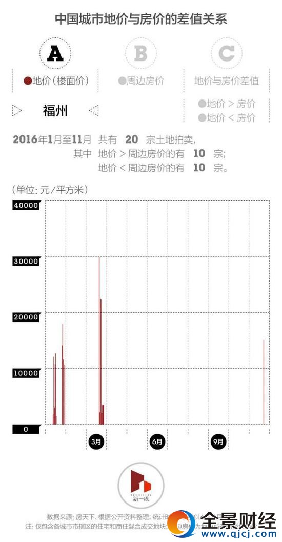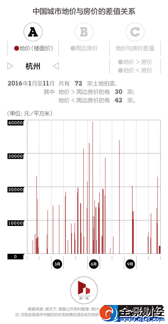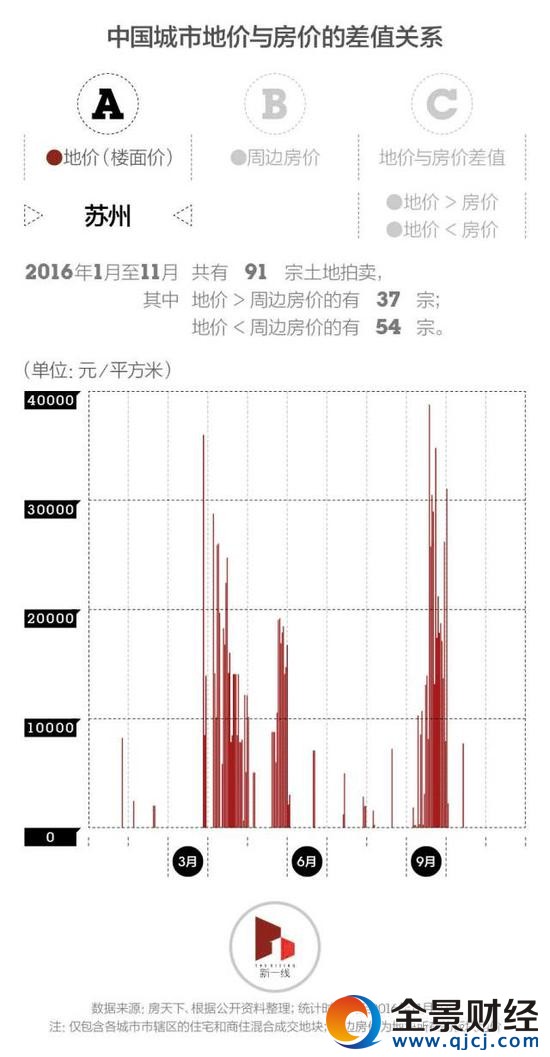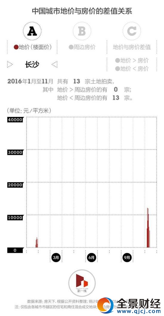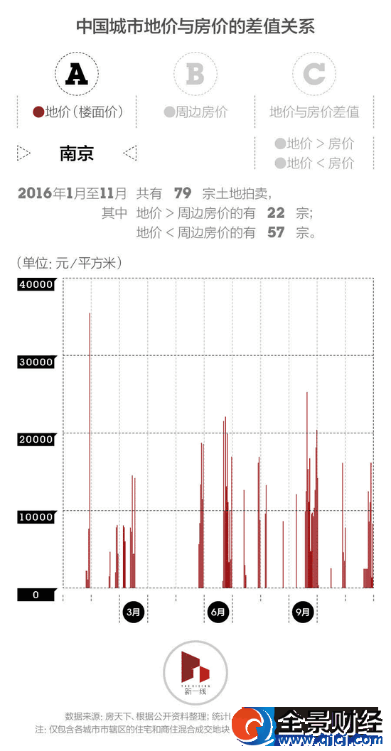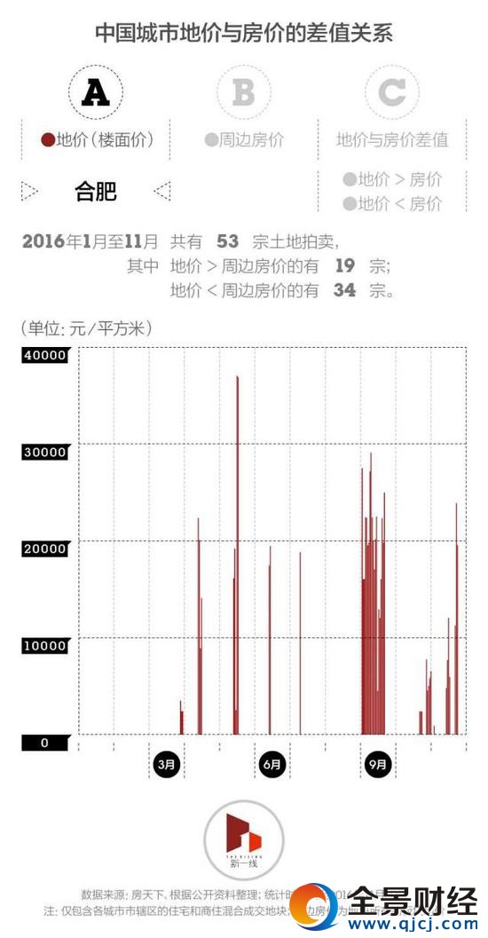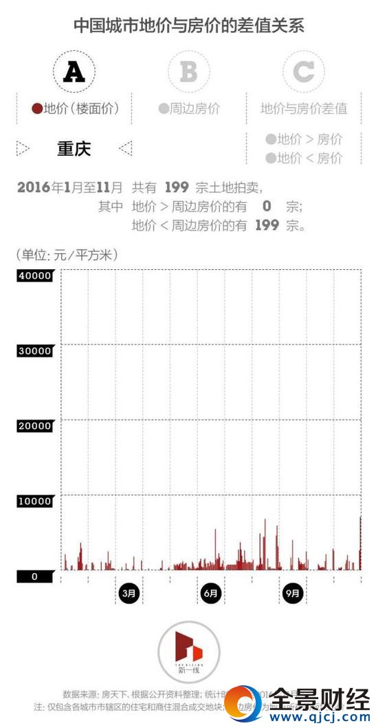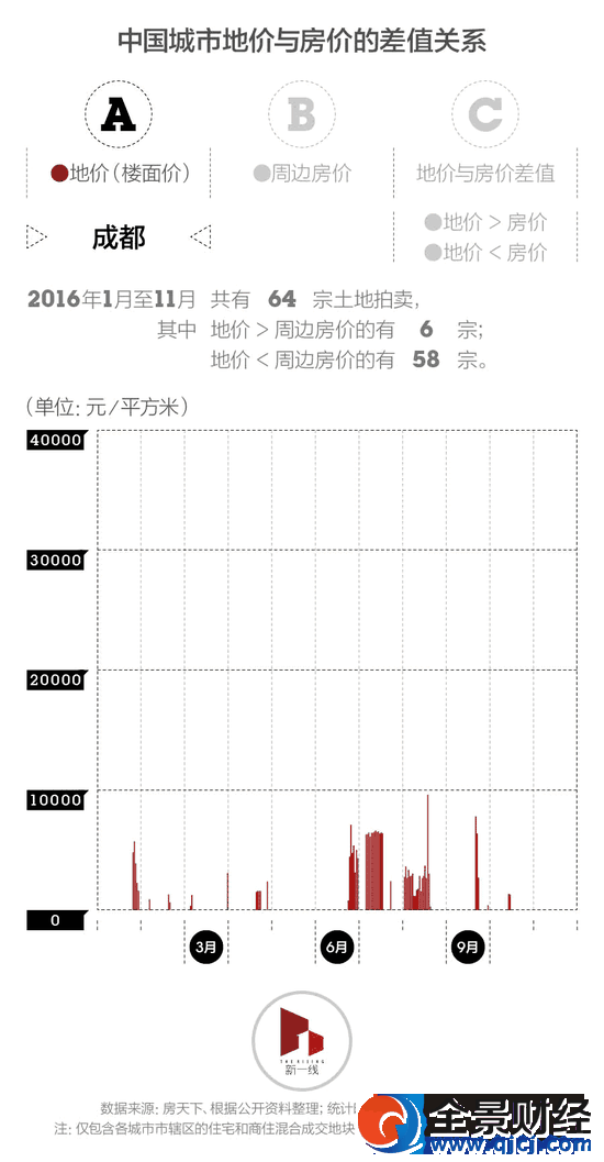 其中前两帧闪过的是每一宗土地成交时的土地楼面价,和当月该地块所属板块的二手房价,第三帧定格的时间会长一些,它显示的是楼面价与周边房价的差值(两者相比价格更高的一端在上)。
