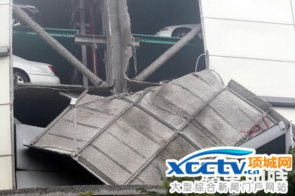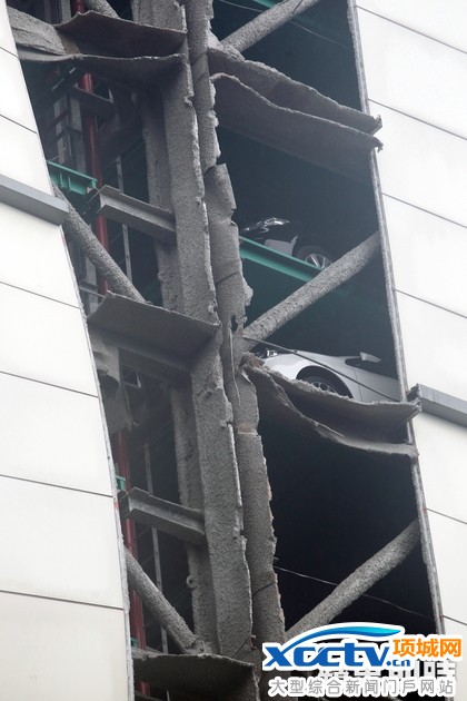 停车场外墙毁损,内部钢骨与车辆清晰可见。
