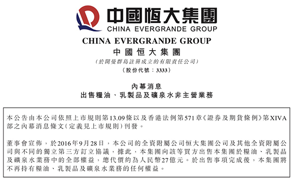 恒大的乳业集团公司的总代价约为人民币3亿元,买方为深圳市明晟都灵商贸有限公司及SunlightPropertyManagementLimited。