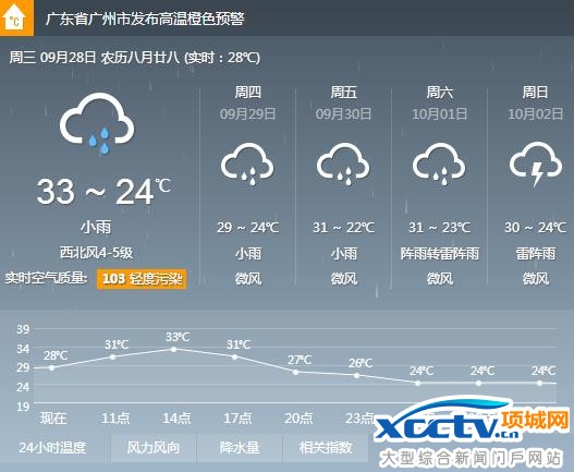 【广州市今日天气】据广州市气象台预测:今日白天:多云到阴天;夜间:阴天,有中到大雨;气温介于24到32℃之间;相对湿度介于60%~95%之间;吹和缓至清劲的偏北风。(广州市气象台2016年09月28日07时30分发布)