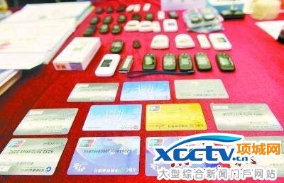 ↑广东警方展示缴获的电信诈骗涉案银行卡、电子密码器等。
