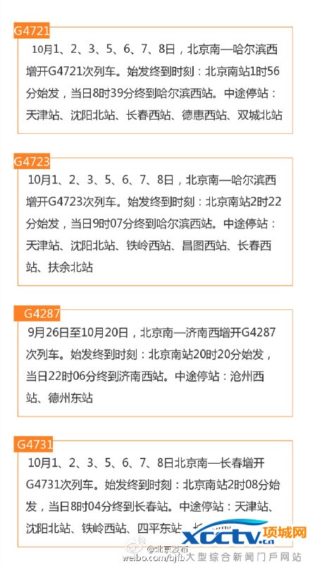 ●9月26日至10月20日,北京南—济南西增开G4287次列车。始发终到时刻:北京南站20时20分始发,当日22时06分终到济南西站。中途停站:沧州西站、德州东站。