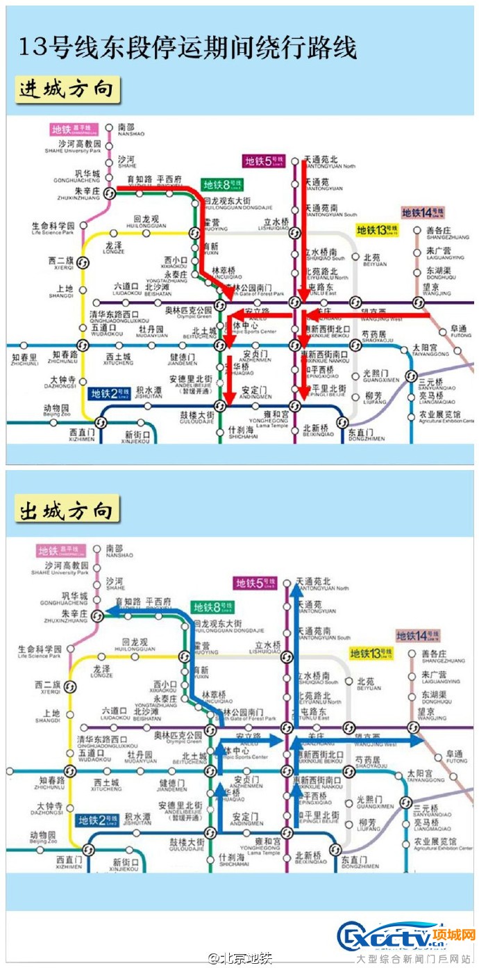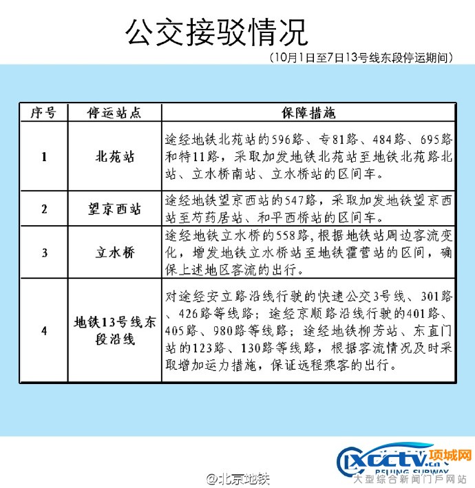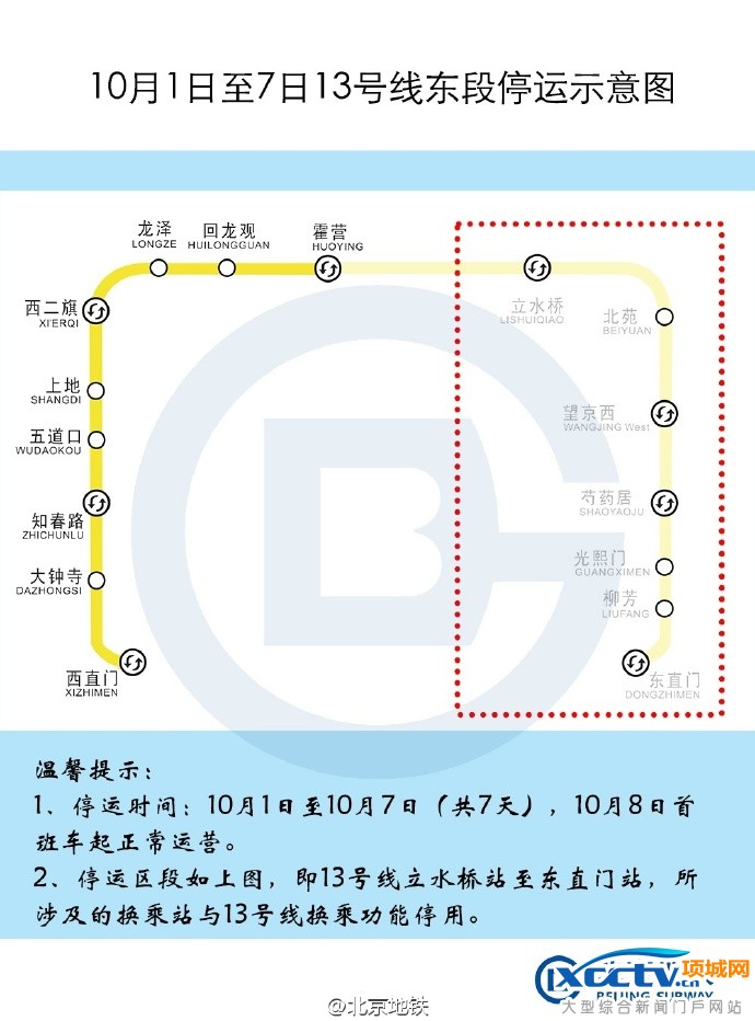 为配合北苑路北延最后300米道路建设,实现明年初北苑路北延工程完工通车。13号线东段(立水桥—东直门)将于10月1日首班车起至7日末班车止停止运营,换乘站停止换乘。期间西段(西直门—霍营)最小运行间隔为4分30秒。10月8日首班车起,13号线恢复全线运营。请乘客提前安排好出行路线,给您带来的不便敬请谅解。