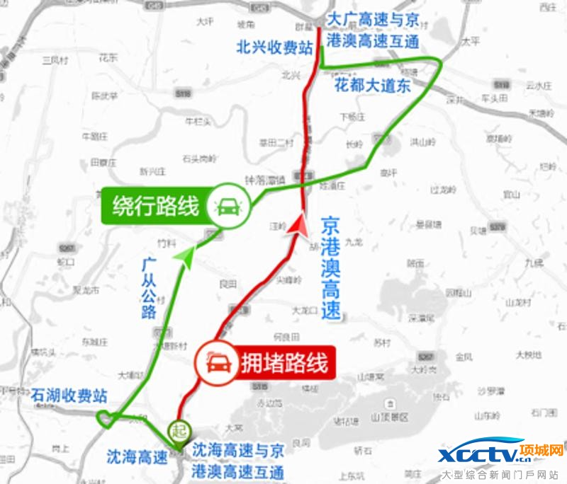 拥堵绕行建议:由沈海高速与京港澳高速互通转向沈海高速行驶,从石湖收费站下高速,沿广从公路-花都大道东行驶,在北兴收费站上高速。