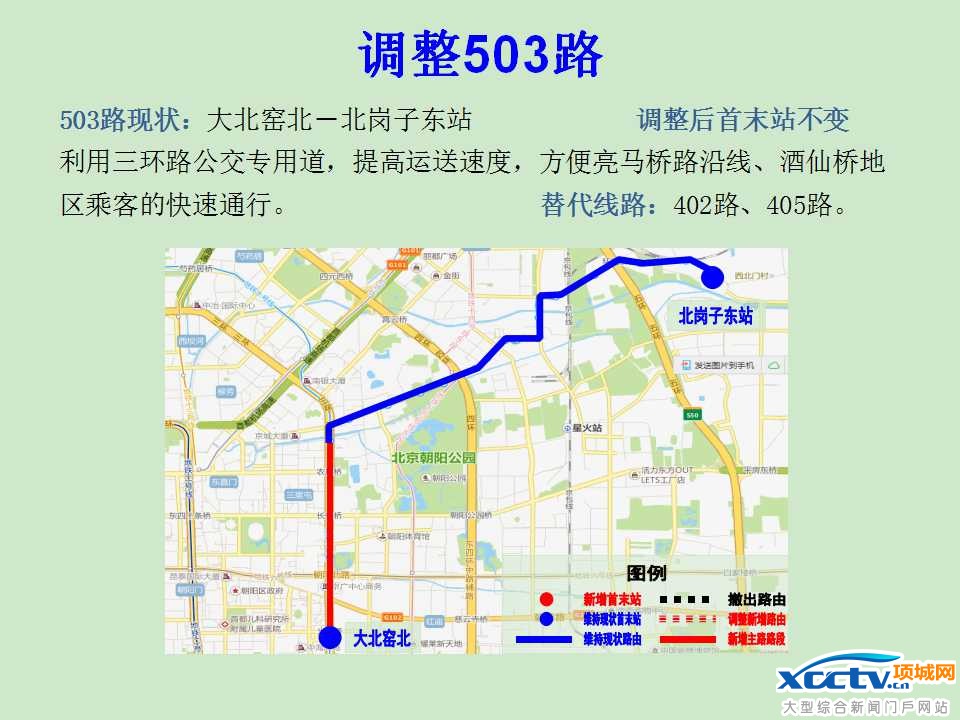 3、调整503路(大北窑北-北岗子东站)。调整后首末站不变,营业时间:大北窑北6:10-22:00,北岗子东站5:30-21:20。光华桥-燕莎桥段改行主路公交专用道,该路段原辅路站位调整至三环主路站位,同时撤销白家庄站辅路站位。