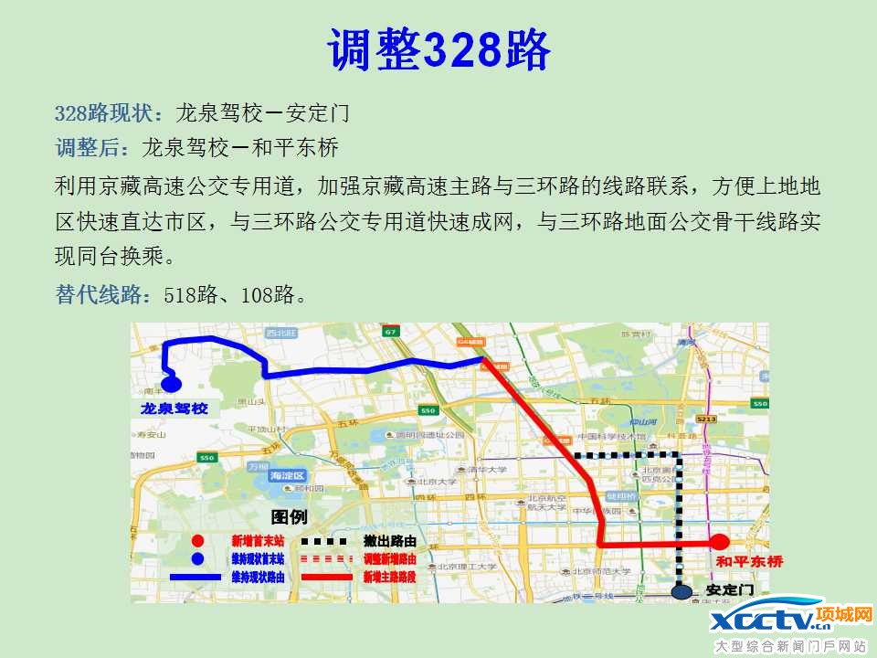 4、调整328路(龙泉驾校-安定门)。调整后首末站:龙泉驾校-和平东桥,营业时间:龙泉驾校5:30-22:00,和平东桥6:00-22:30。由清河小营桥进入京藏高速主路,至马甸桥连接三环主路公交专用道。