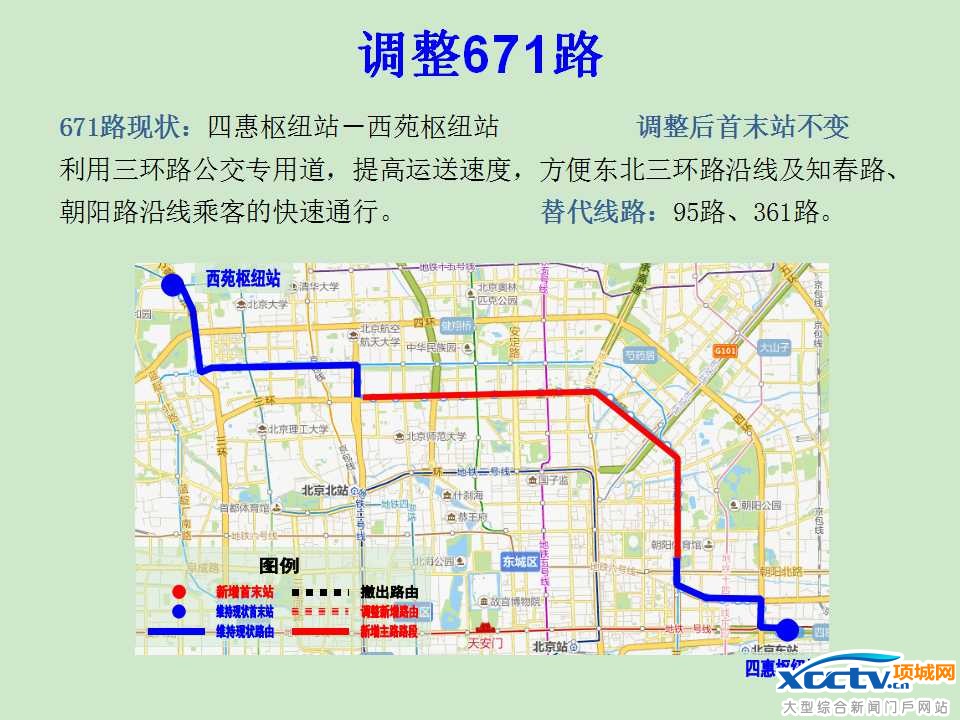 | 671 | 四惠枢纽站-西苑枢纽站 | 调整 | 长虹桥-蓟门桥改行三环主路,经由公交专用道,中途站位改停主路站位。 | 增设:安贞桥东 撤销:白家庄(单向) 农业展览馆 燕莎桥南 太阳宫桥 和平东桥 和平西桥 马甸桥西(单向) 北太平桥东(单向) 蓟门桥东 | 利用三环路公交专用道,提高运送速度,方便东北三环路沿线及知春路、朝阳路沿线乘客的快速通行。 | 5:30-22:00 | 95/361 |