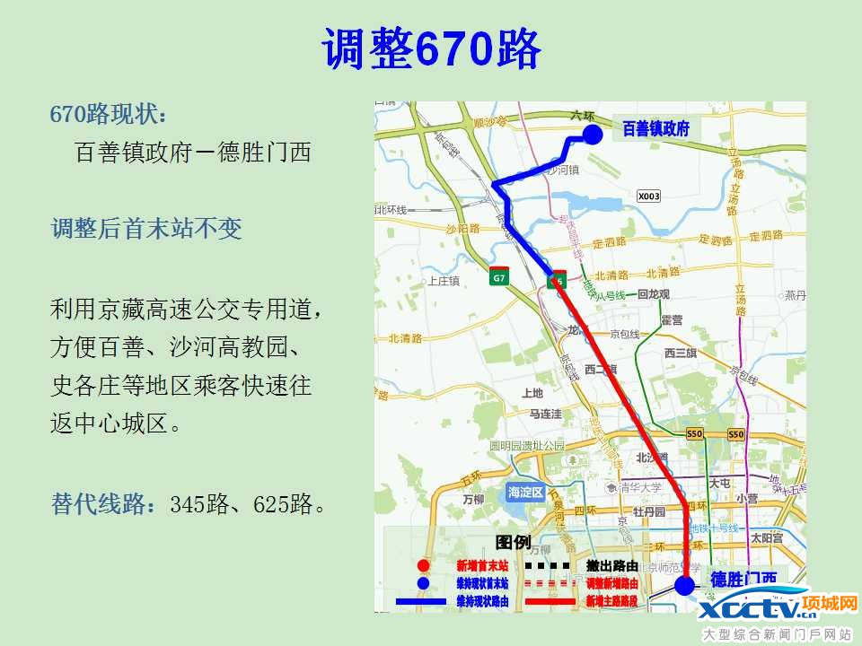 1、调整670路(百善镇政府-德胜门西)。调整后首末站:百善镇政府-德胜门西,营业时间:百善镇政府5:20-21:20,德胜门西6:40-22:30。线路由北清路进入京藏高速主路。