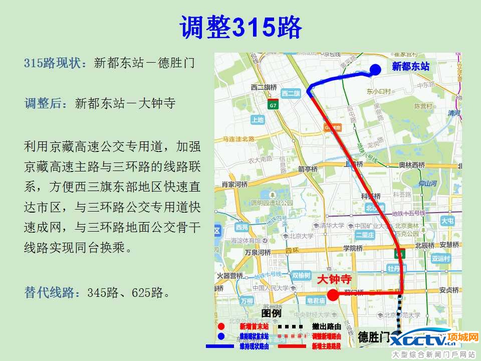 3、调整315路(新都东站-德胜门)。调整后首末站:新都东站-大钟寺,营业时间:新都东站5:20-22:00,大钟寺5:30-23:00。由西三旗进入京藏高速主路,至马甸桥连接三环主路公交专用道。