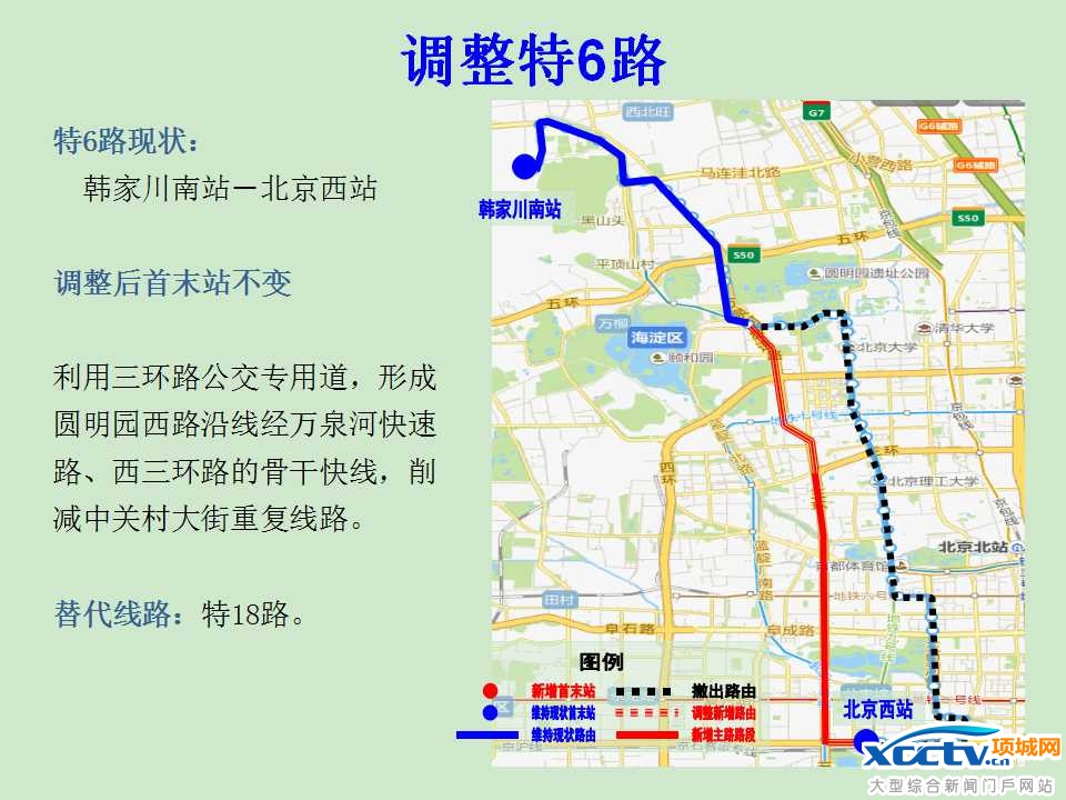 | 特6 | 韩家川南站-北京西站 | 调整 | 由韩家川南站发出,沿特6路原路由至西苑,经万泉河快速路、西三环路至莲花桥,向东至北京西站。 | 增设:西苑医院 万寿寺 紫竹桥 花园桥北 航天桥 公主坟南 撤销:颐和园路东口 圆明园南门 清华大学西门 中关园北站 中关园 中关村南 海淀黄庄北 海淀黄庄南 人民大学 中国农业科学院 魏公村 中央民族大学 国家图书馆 白石桥南 四道口东 甘家口大厦 甘家口北 木樨地北 公安大学 白云观 | 利用三环路公交专用道,形成圆明园西路沿线经万泉河快速路、西三环路的骨干快线,削减中关村大街重复线路。 | 韩家川南站5:30-21:00 北京西站5:30-21:30 | 特18 |