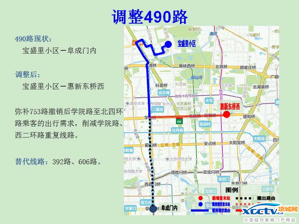 | 490 | 宝盛里小区-阜成门内 调整后:宝盛里小区-惠新东桥西 | 调整 | 由宝盛里小区发出,沿490路原路由至学院桥,向东沿北四环路至惠新东桥西。 | 增设:清河南镇(单向) 清河北(单向) 学院桥东 志新桥西 健翔桥西 健翔桥东 北辰桥西 亚运村 安慧桥东 惠新东桥西 撤销:北京航空航天大学 学知桥北(单向) 蓟门桥北 蓟门桥(单向) 蓟门桥南(单向) 明光桥北(单向) 明光桥南(单向) 文慧桥北(单向) 文慧桥南(单向) 索家坟 西直门南 阜成门北(单向) 阜成门内 | 弥补753路撤销后学院路至北四环路乘客的出行需求,削减学院路、西二环路重复线路。 | 宝盛里小区5:30-22:30 惠新东桥西6:00-23:00 | 392/606 |