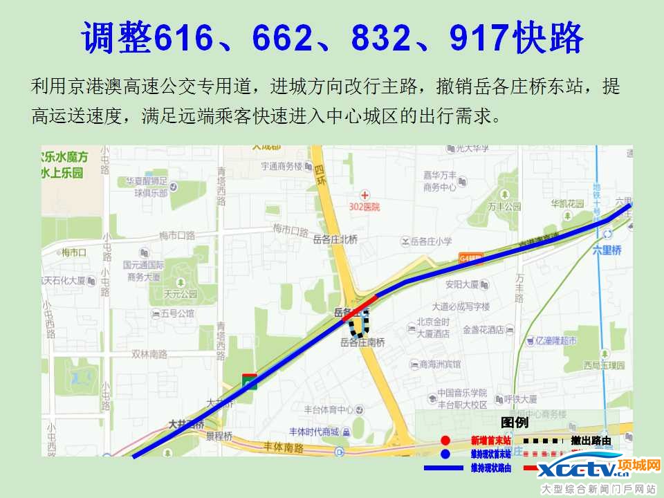 616路、662路、832路、917快4条线路调整为主路直达六里桥,撤销岳各庄桥东站。