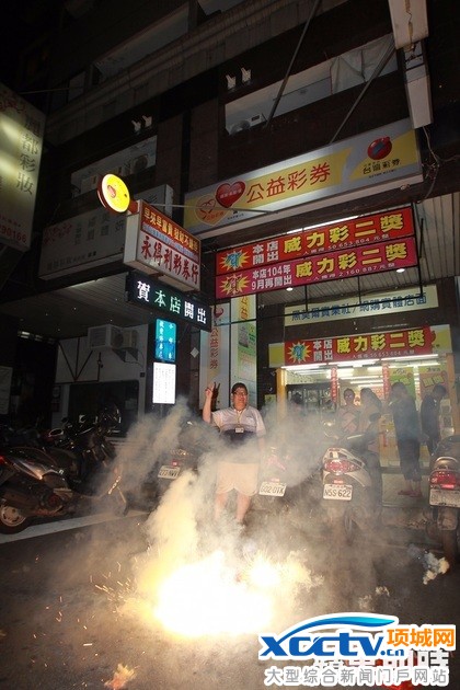 台中市西区永得利彩券行今晚开出大乐透头奖,老闆开心地点鞭炮庆祝。