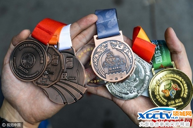 这是崔欢获得的部分马拉松和各种铁人三项比赛的奖牌。