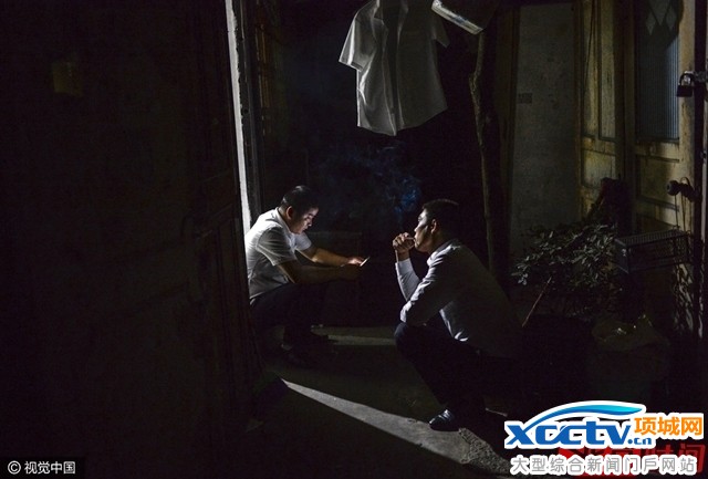 陈浩(左)和同为开专车的老乡在出租屋外蹲坐着聊天。