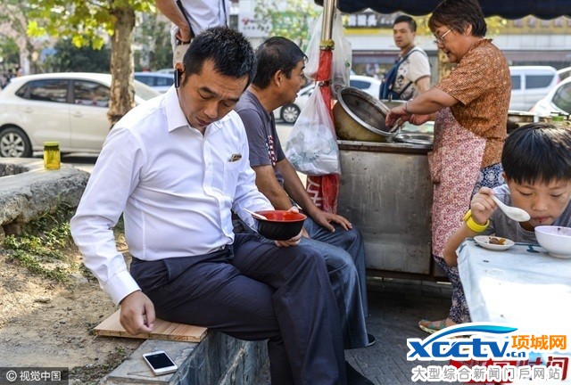 吴强在家门口的路边摊吃早饭,边处理专车订单。