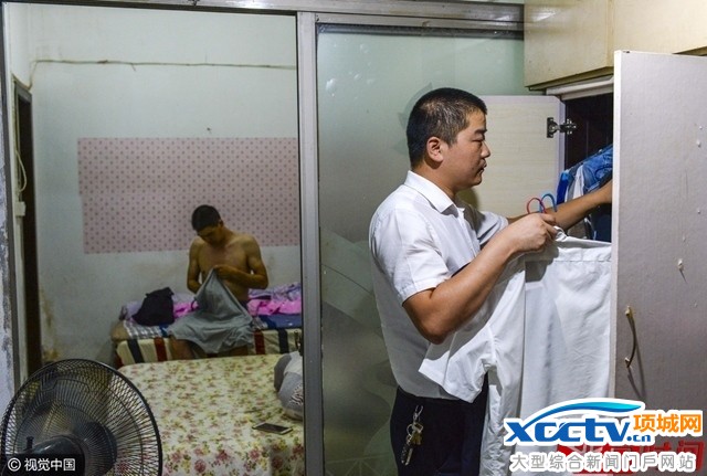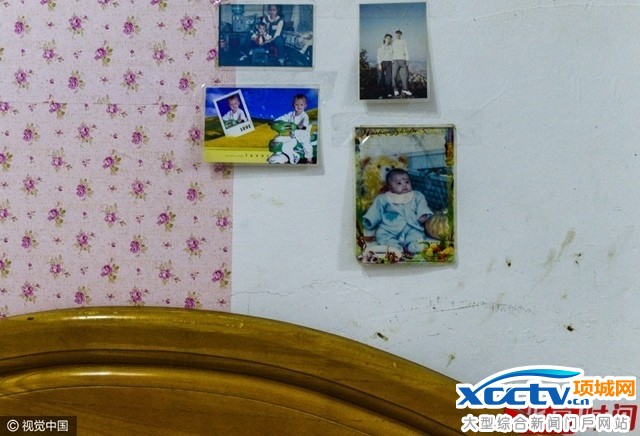 在陈浩简陋的出租屋里,床头贴着的妻儿的照片。
