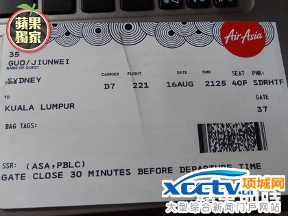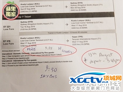 台北郭先生说,他从澳洲搭乘亚航到吉隆坡,因为班机迫降墨尔本,须重新安排航班,他明明是搭乘8月17日上午9时35分的班次,事后地勤却称他须再改到12小时后的班机,非常夸张。 郭先生出示原航班机票。