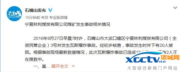 中新网9月28日电27日早晨,宁夏石嘴山市宁夏林利煤炭有限公司煤矿3号井发生瓦斯爆炸事故。28日凌晨,宁夏石嘴山市委外宣办、市政府新闻办官方微博发布事故情况说明,经初步核查,事故发生时井下有20人被困。根据事故现场最新救援情况,此次瓦斯爆炸事故已造成18人遇难,还有2人正在搜救中。