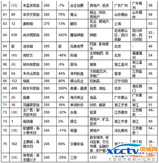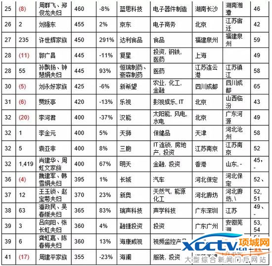 53岁的张近东780亿元下降1位到第十。今年6月,苏宁20亿元收购国际米兰70%股份。苏宁控股除了电商和零售以外,主要覆盖商业地产、文化和体育领域,拥有苏宁云商、PPTV等相关领域知名品牌,拥有员工18万人。