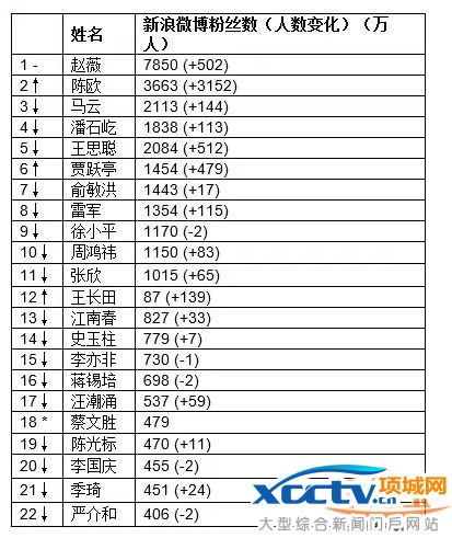 赵薇仍然是微博最红的企业家,陈欧超越马云成为新浪微博第二红的企业家,近一年粉丝增长近一倍。