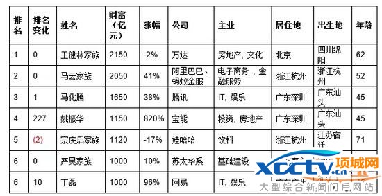 ●62岁的王健林及其家族以2150亿财富第三次成为中国首富。52岁的马云及其家族财富增长41%到2050亿,保持第二。45岁的马化腾虽然已经捐了139个亿,但财富仍然增长了38%到1650亿,上升1位到第三。