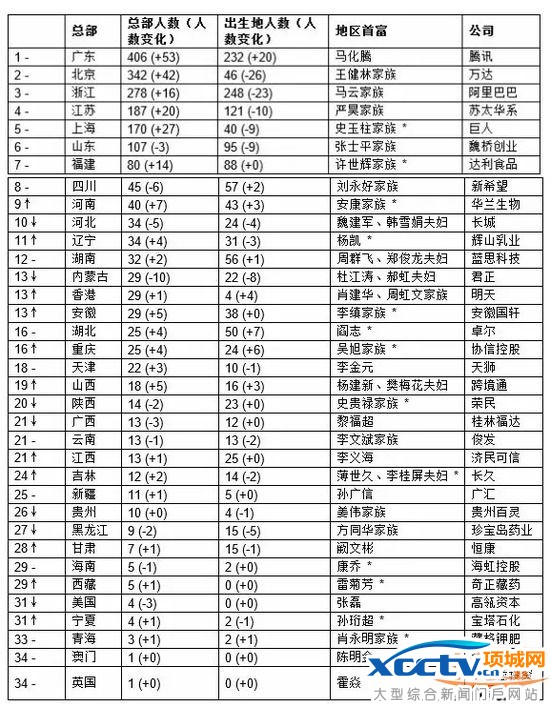广东仍然是最多上榜企业家设立企业总部的地区,有406位,又比去年增加53位;北京仍为第二,有342位,比去年增加42位;浙江保持第三,有278位,比去年增加16位;排名上升最快的是内蒙古,其次是山西和黑龙江。对比去年,有13位新的地区首富。只有35位上榜企业家将企业总部设在大陆以外,其中,香港最多,有29位;美国第二,有4位;英国和澳门并列第三,各有1位。