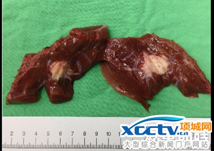 八月大男婴切除罹癌的左肝(白色处为癌细胞部位)。