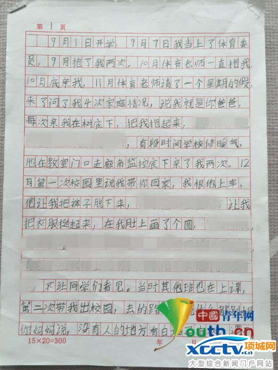 小雪笔记中写到,“9月1日开学,9月7日我当上体育委员,9月抱了我两次。10月体育老师一直抱我,10月底亲我,11月体育老师请了一个星期假,来了问了我4次家庭情况,说我就是你爸爸,每一次亲我在树底下……(删20字)”。