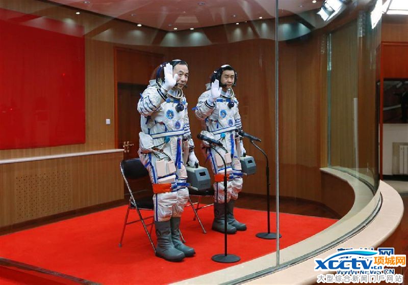 10月17日,神舟十一号航天员出征仪式在酒泉卫星发射中心举行。这是航天员景海鹏(左)、陈冬在出征前挥手。 新华社记者李刚摄