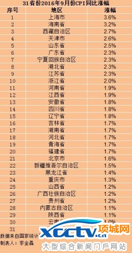 在31个省份中,上海9月份CPI涨幅全国最高,为3.6%,涨幅比8月回升0.6个百分点。数据显示,上海CPI涨幅自今年3月份开始已连续7个月处于“3时代”。
