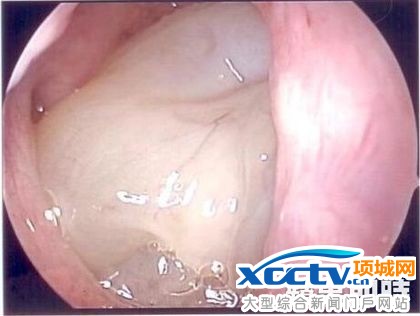 50多岁男子左侧鼻腔长满瘜肉状肿瘤(中间至左方的乳白色肿块),确诊为倒生性乳突瘤。