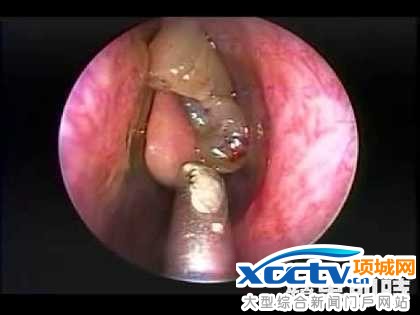 医师对患者施以微创旋转刀鼻窦内视镜手术,以清除其鼻窦严重病变的组织。