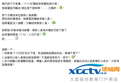 公务员準时下班引起许多网友讨论!一名网友在《mobile01》论坛po文,有天下午5点01分打电话到某国税局分局,电话已转成「现在是下班时间」,他按下分机,有位服务人员接听,帮他转给承办人员,结果电话没人接,服务人员表示,应该已经下班了,「此时看时间是:17:02,人已不见?」他好奇,如果17点02分已打卡下班,「到底几点就开始收拾,準备下班了?」、「台湾的公务人员现在都这样吗?多次接触公务机关的感觉,聘僱人员的服务态度及积极度,普遍比正式公务员要好上很多,大家有这种感觉?」这篇文章引起许多网友讨论,「公家机关已经比台湾90%以上的私人企业準时下班,不然每次招考一堆人考假的吗?」、「时间到,可以选择不接电话,慢慢下班,接了,难道3秒钟可以接决民众问题吗?」、「上班努力就好,下班準时,没错啊」、「你不在上班时间打,偏偏要在时间后才打,然后才来怪人?」、「下班时间到,不能下班吗?」(即时新闻中心/综合报导)
