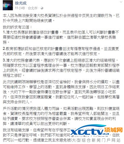 清大前学生会长徐光成不爽清大校长贺陈弘合併过程中反民主的独裁行为,宣布昨晚6时起绝食抗议。