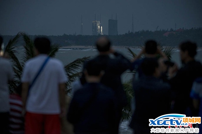 11月3日20时43分,中国最大推力新一代运载火箭长征五号,在中国文昌航天发射场点火升空,约30分钟后,载荷组合体与火箭成功分离,进入预定轨道,长征五号运载火箭首次发射任务取得圆满成功。图为在海南省文昌市龙楼镇淇水湾聚集了众多民众观看长征五号发射。中新社记者 骆云飞 摄
