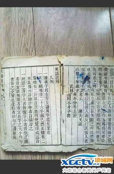七八年前,成都市民尧先生从重庆的旧书市场淘回一堆旧书,其中一本没有封面的繁体字书籍引发了他的兴趣。“繁体字下面还有英语字母。”尧先生告诉记者,这本书共有四五十页,从左往右翻,开始的几页里面有“咸丰十年”(1860年)的字样。