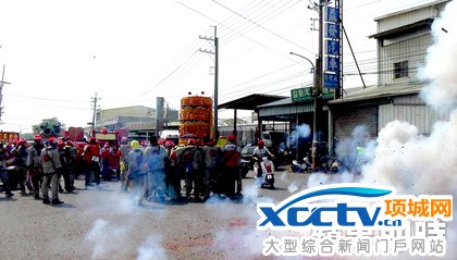 鲜绿农产科技公司董事长熊亚萍在果菜市场前摆起50公尺烟火阵地施放迎驾。