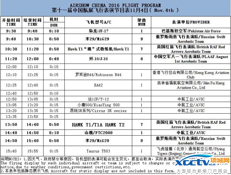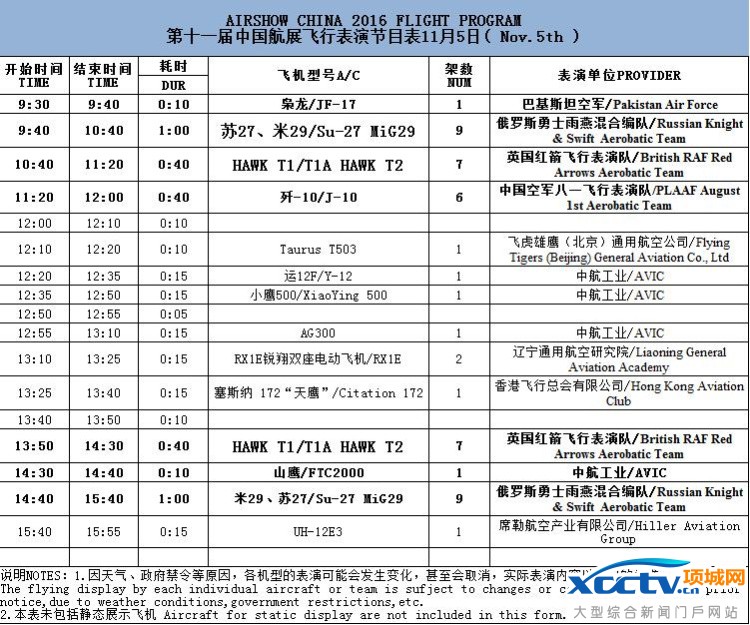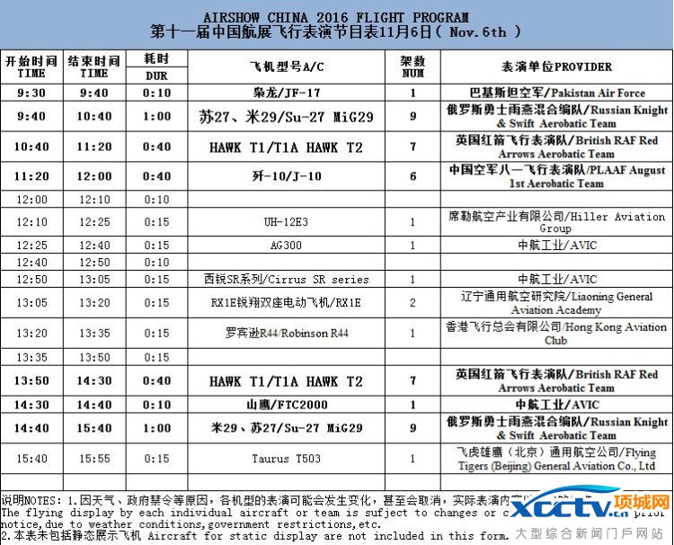 2016珠海航展飞行表演节目表(11月4日-6日):
