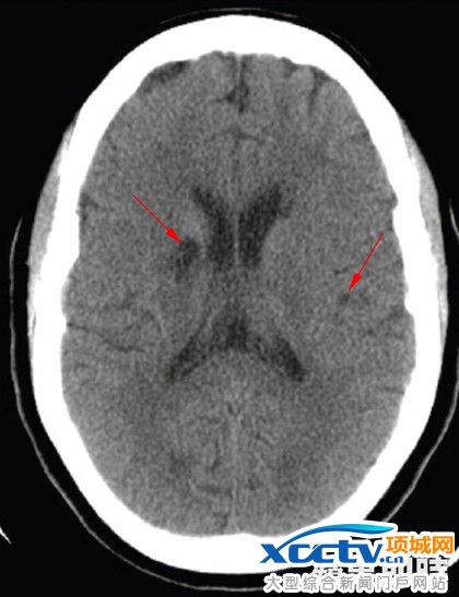 断层扫描可见脑部有小黑洞(箭头指处),所以称小洞性脑梗塞。