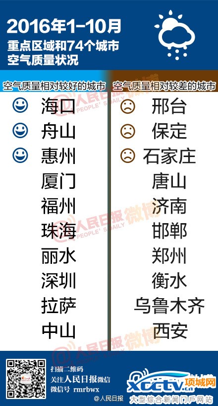 【2016年1-10月空气质量“红黑榜”你家上了哪个榜?】环保部发布:2016年1-10月74个城市空气质量状况后10位城市依次是:邢台、保定、石家庄、唐山、济南、邯郸、郑州、衡水、乌鲁木齐和西安;前10位城市依次是:海口、舟山、惠州、厦门、福州、珠海、丽水、深圳、拉萨和中山市。
