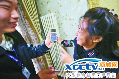 13日,在朝阳惠泽园小区,市热力集团的工作人员来到住户家中测温,查看供暖情况。饶强摄