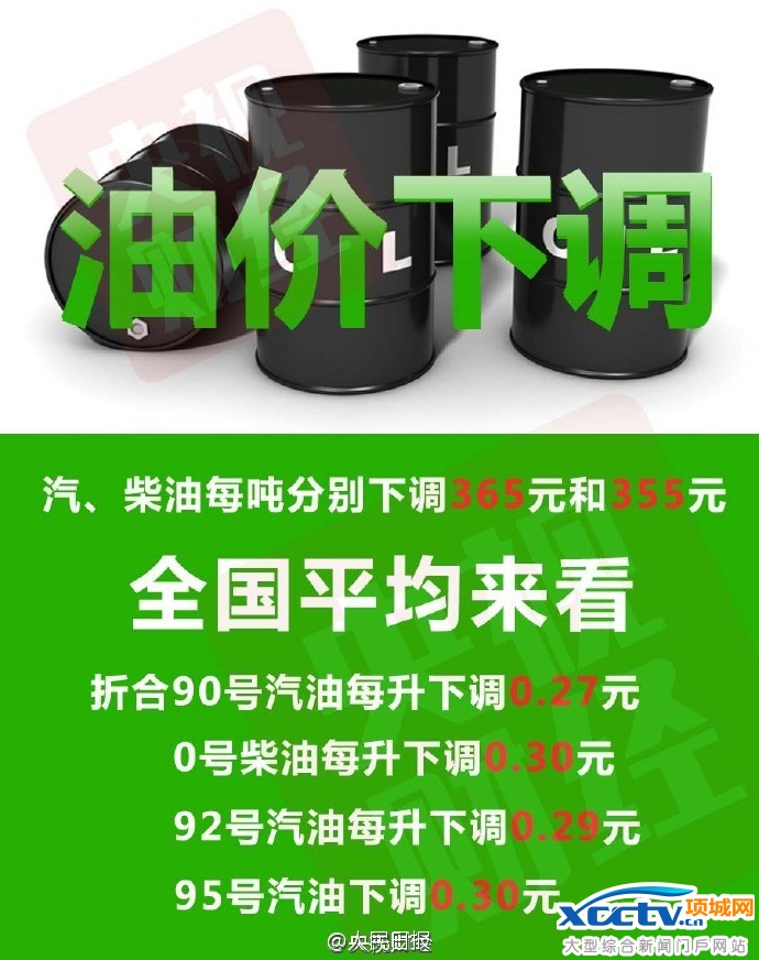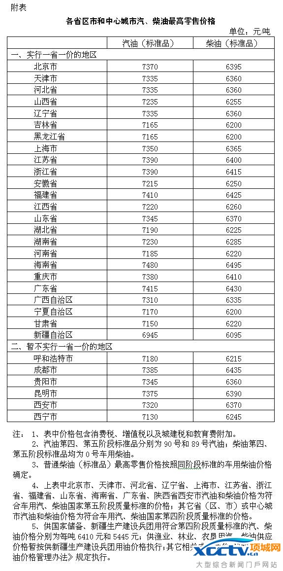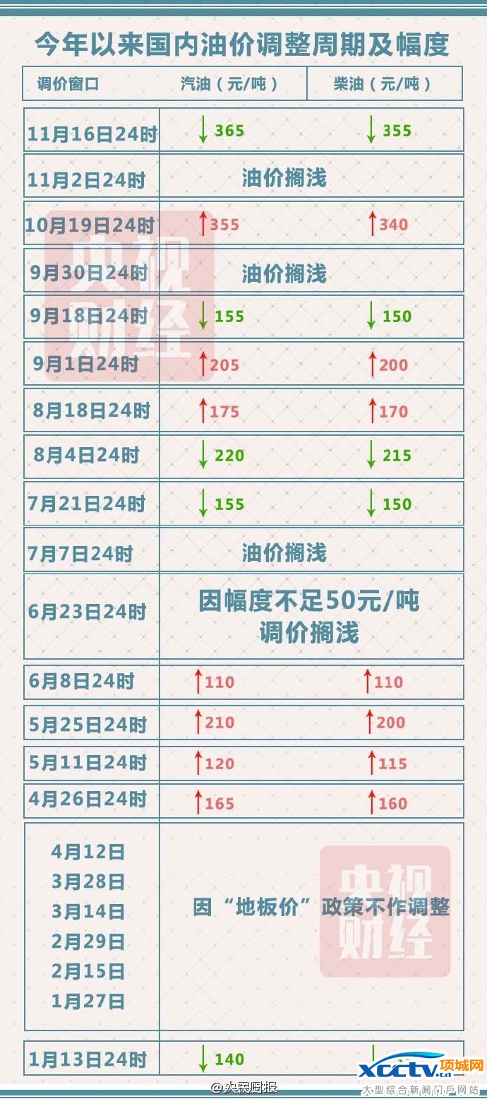 根据近期国际市场油价变化情况,按照现行成品油价格形成机制,自2016年11月16日24时起,国内汽、柴油价格(标准品,下同)每吨分别降低365元和355元。调整后,各省(区、市)和中心城市汽、柴油最高零售价格见附表。相关价格联动及补贴政策按现行规定执行。