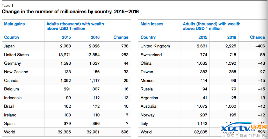 但遗憾的是,英国和中国继续排在了富豪减少的排行榜上。其中,英国情况仍然最严重,2016年百万富豪人数减少了40.6万人,达到了222.5万人;其次是瑞士,减少了5.8万人至71.6万人;而排在第三位的中国则减少了4.3万人,从2015年的163.3万人缩减到了159万人。