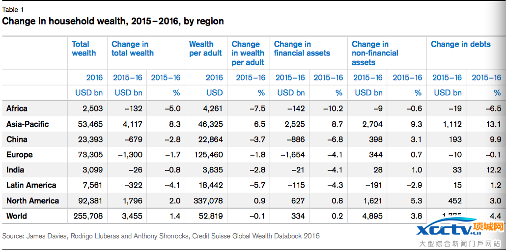 2016年全球各地区家庭财富变化(来源:瑞信《全球财富报告》)