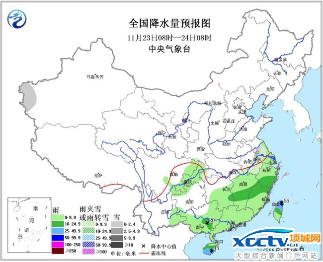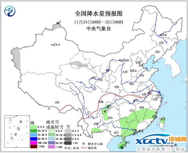 24日08时至25日08时,新疆西部和北部、甘肃西部等地的部分地区有小到中雪;江南南部、广西东部、广东中西部、海南岛及四川盆地东南部、贵州西部、云南南部等地的部分地区有小到中雨。内蒙古中西部、山东半岛、辽东半岛等地的部分地区有4~6级风。东海南部、台湾海峡、南海北部和中西部、北部湾将有7~8级、阵风9~10级的东北风。
