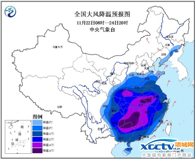 今日“小雪”,受寒潮影响,22日至24日,我国华北南部及其以南的大部地区将自北向南先后出现大范围大风降温天气,平均气温将普遍下降6~10℃,其中,陕西南部、黄淮南部、江淮中西部、江汉、江南中西部、华南北部以及四川东北部、重庆东部、贵州中东部等地气温将下降12~14℃,湖南中南部、贵州东南部、广西北部等地的部分地区降温可达16℃以上。上述地区伴有4~6级偏北风,东部和南部海区风力有7~8级,阵风9~10级。