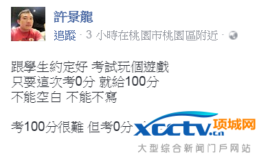 这个老师!算您狠!一位老师许景龙在脸书上PO出某高中「计算机概论」第一学期期中考考卷,老师写道:「跟学生约定好,考试玩个游戏!只要这次考0分,就给100分!」、「不能空白 ,不能不写…」还备注,「考100分很难,但考0分更难喔」!网友大讚「逆向思考,厉害」,该名老师也回应「哈哈 可以引起他们读书的兴趣」;还有网友开玩笑「当你的学生真的很可怜,到时候父母问起来还以为自己的小孩在说谎」,该名老师也回应「不会 想玩这游戏的人 会比较认真」!(即时新闻中心/综合报导)